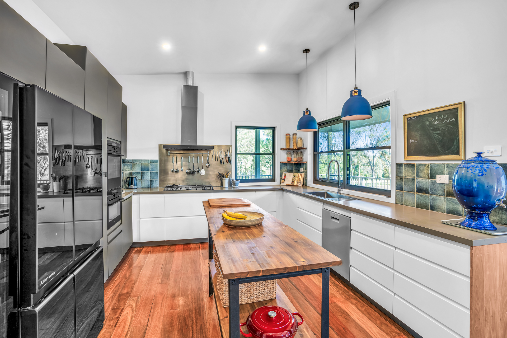 Kitchen features a fantastic amount of storage and bench space, deep S/S sink, AEG appliances including wall oven and grill, 5 burner gas benchtop cooker, dishwasher, space for double refrigerator and wine cooler, feature pendant lighting and modern hopper windows -