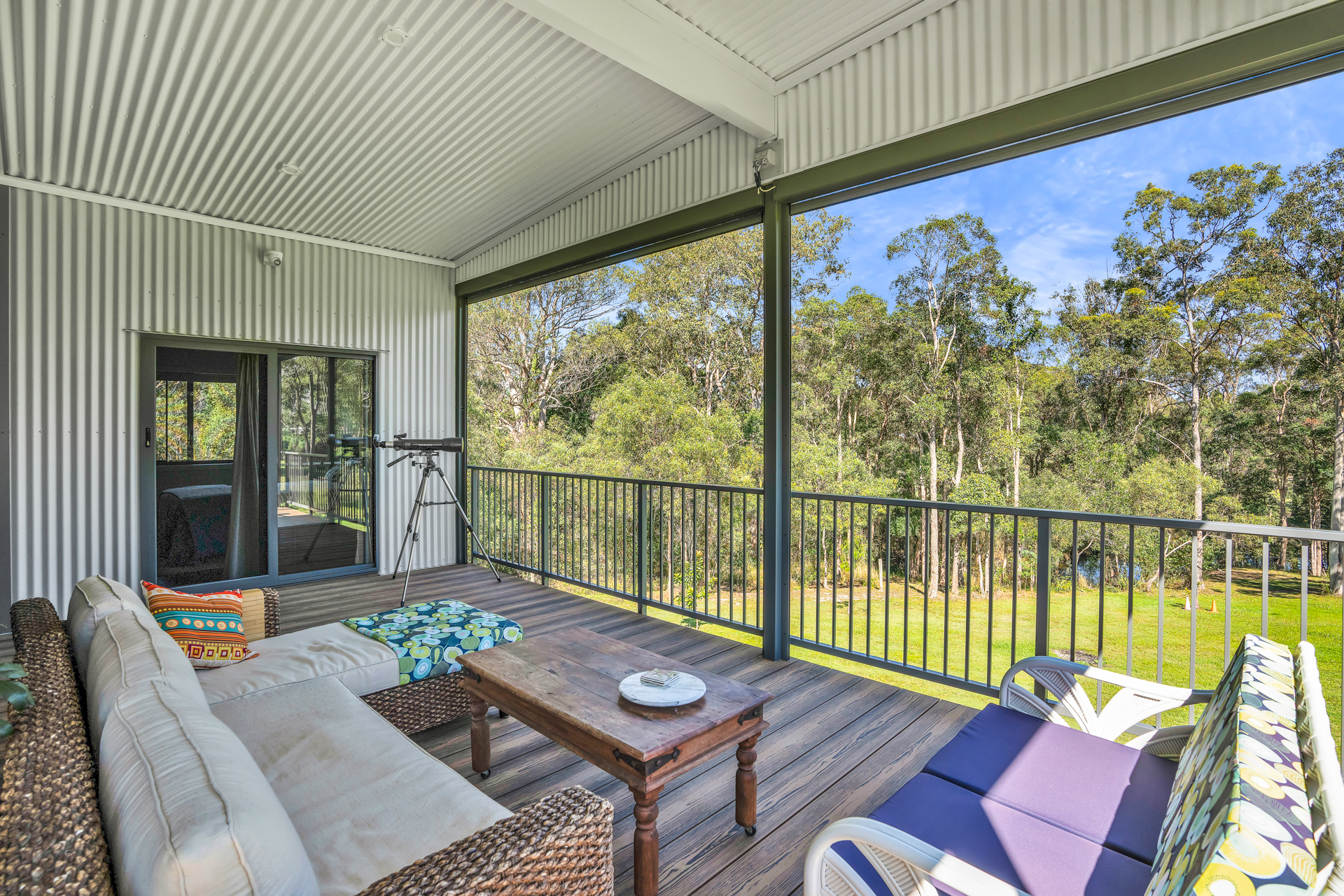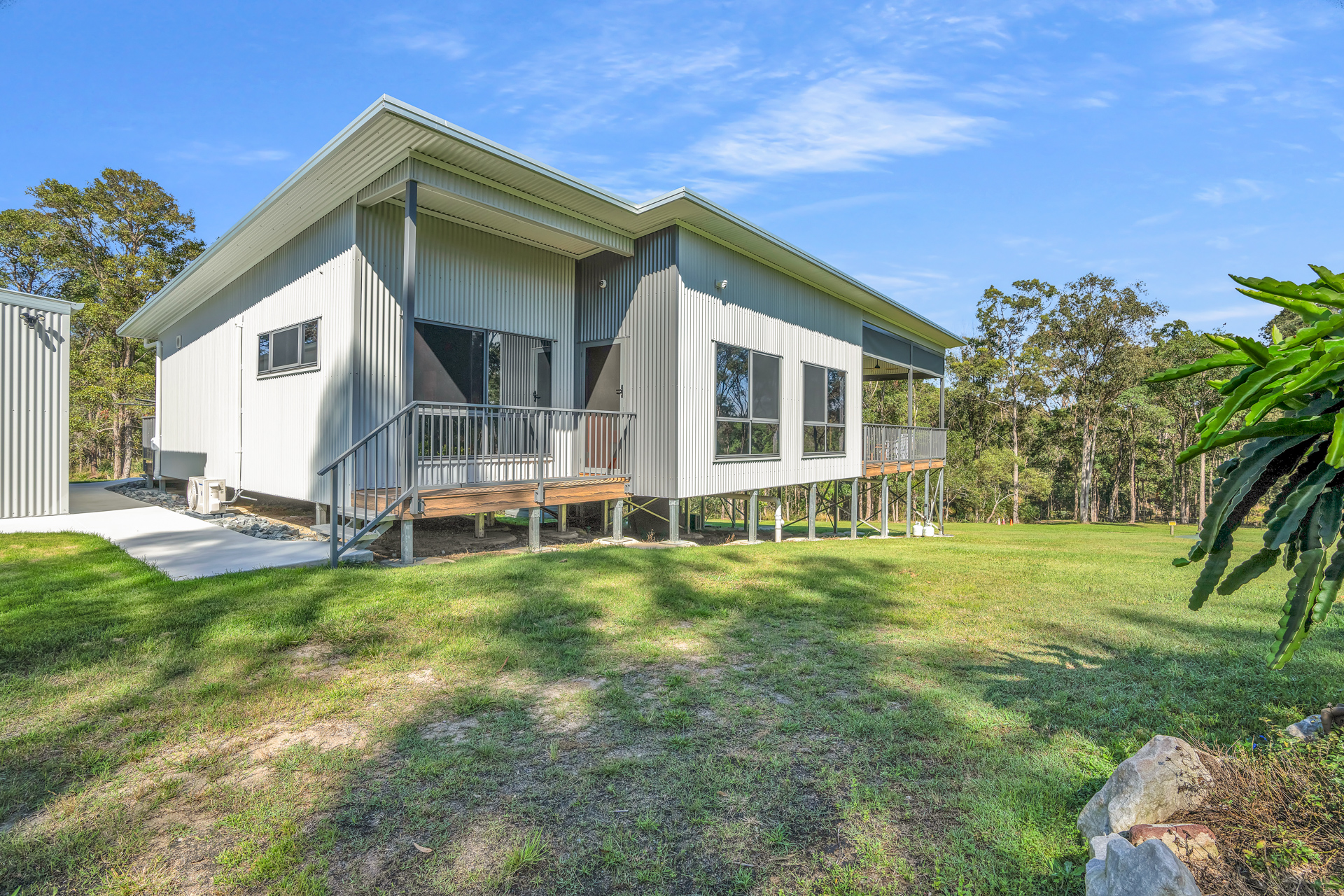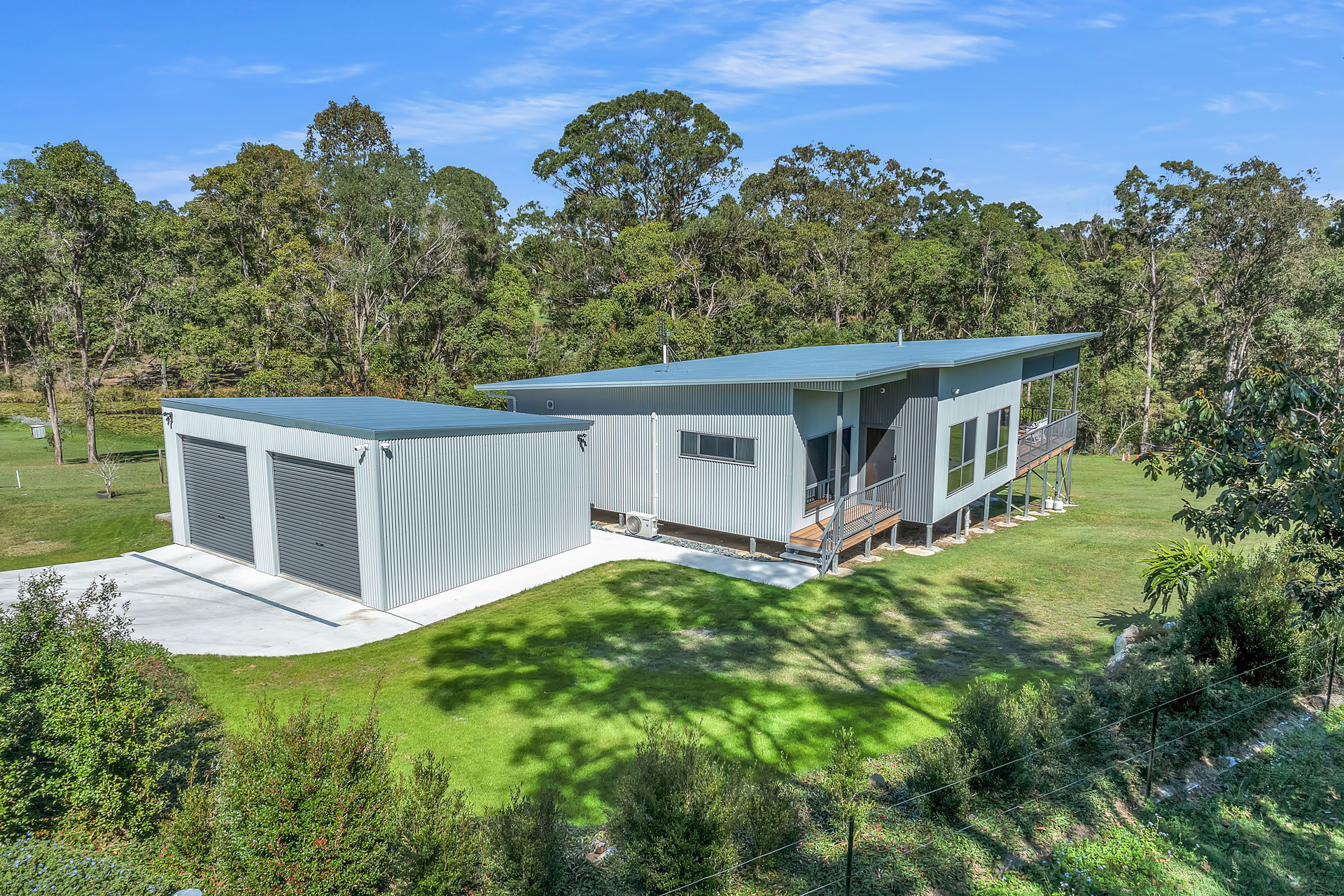 Elevated North facing steel frame, steel clad, architecturally designed 3 bedroom home privately positioned on a park-like 1.4 acres (5,701m2) -