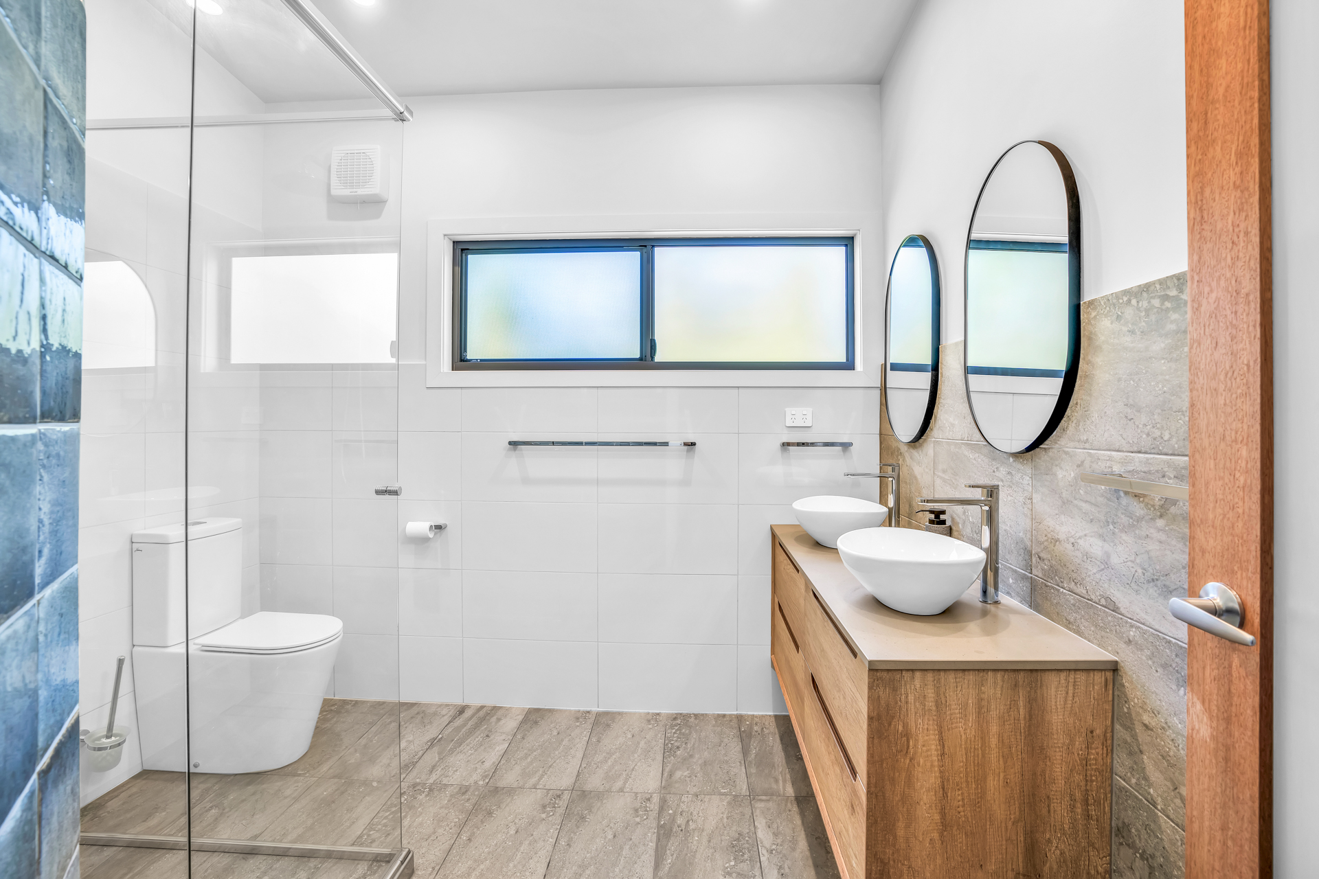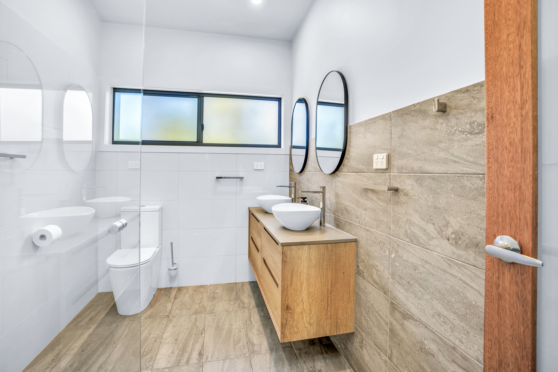 Main bathroom features W/C, double spacious floating vanity with sensor lights -