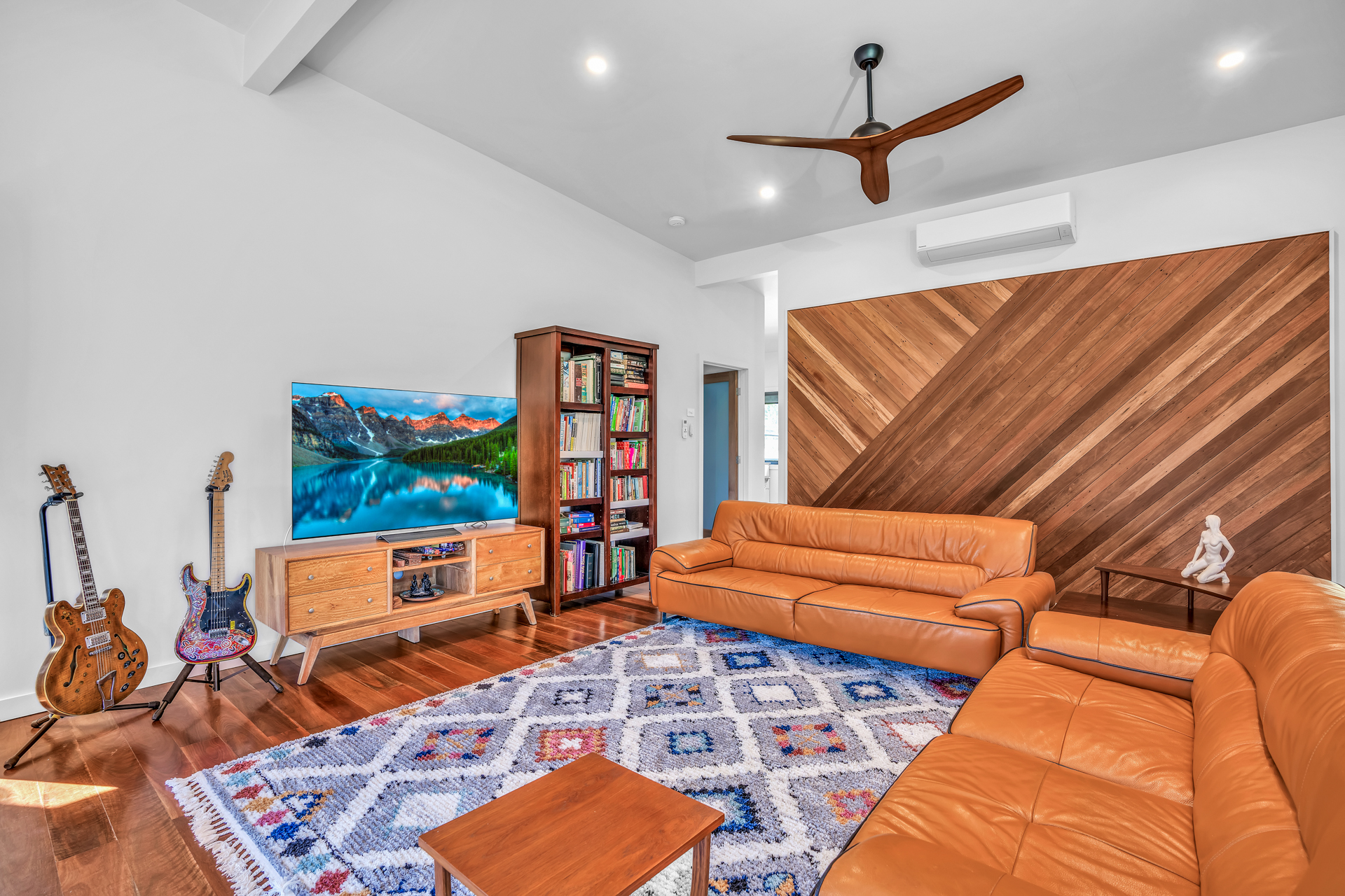 Dining and lounge area is spacious with timber feature wall, A/C and ceiling fans -