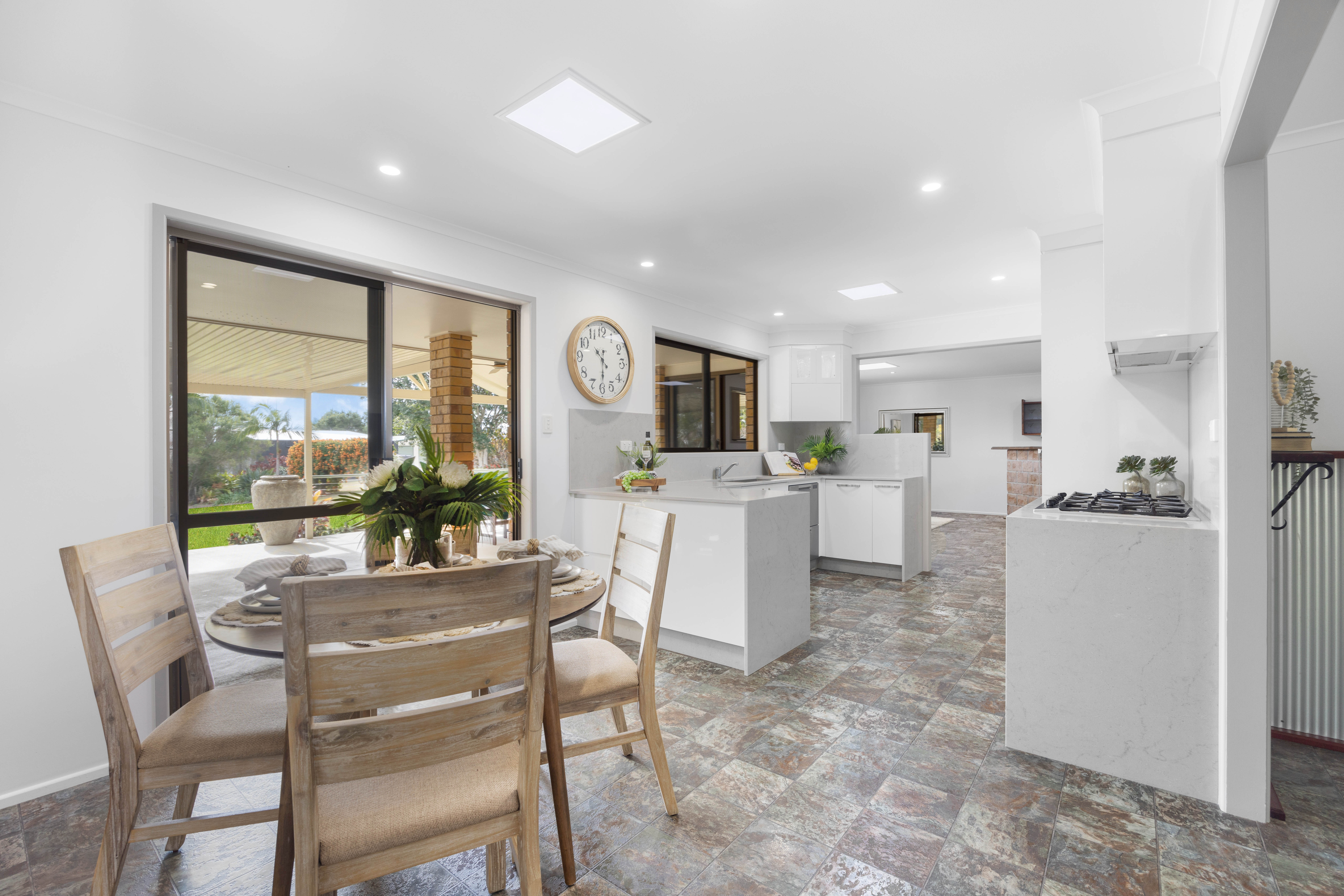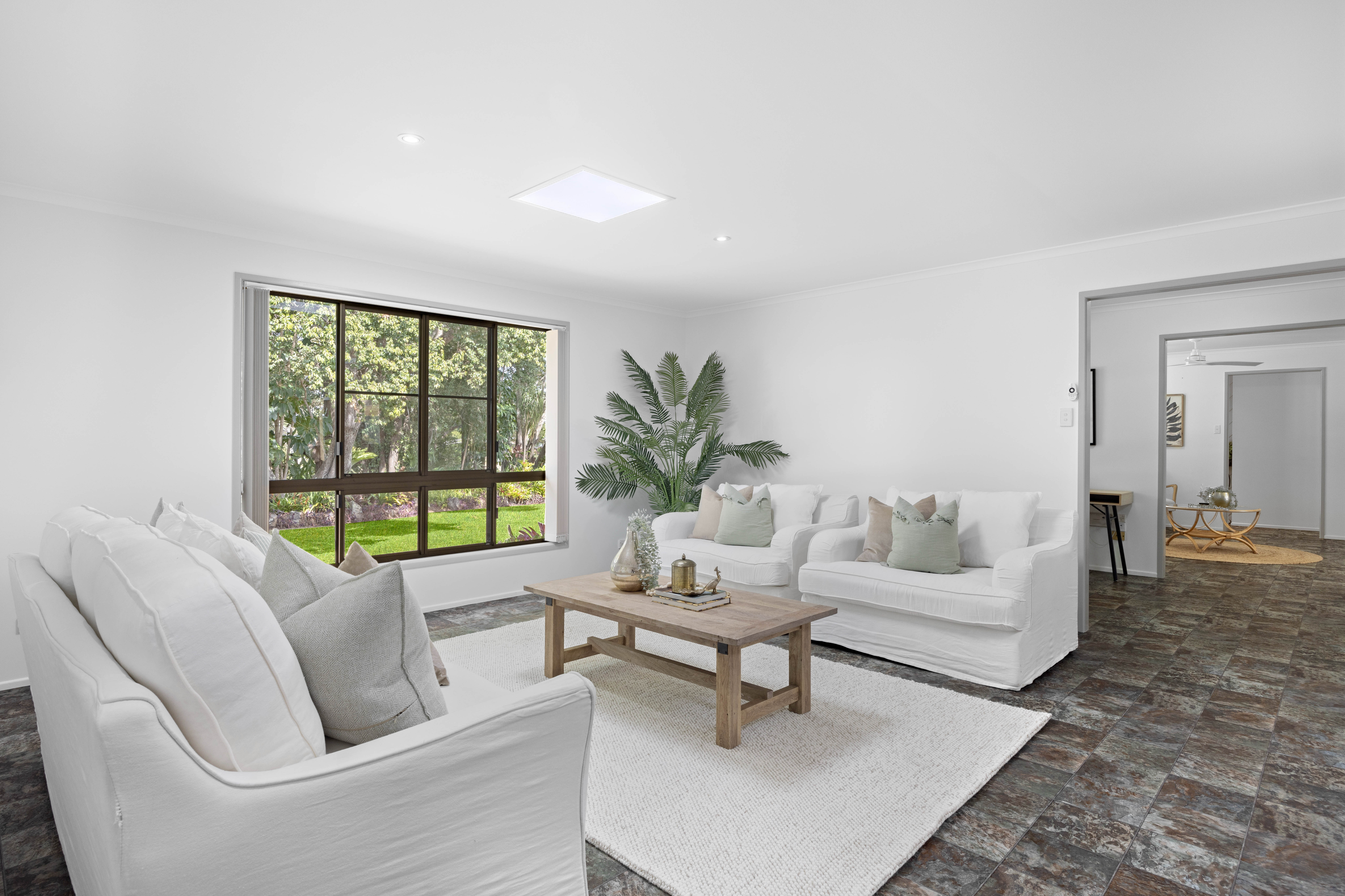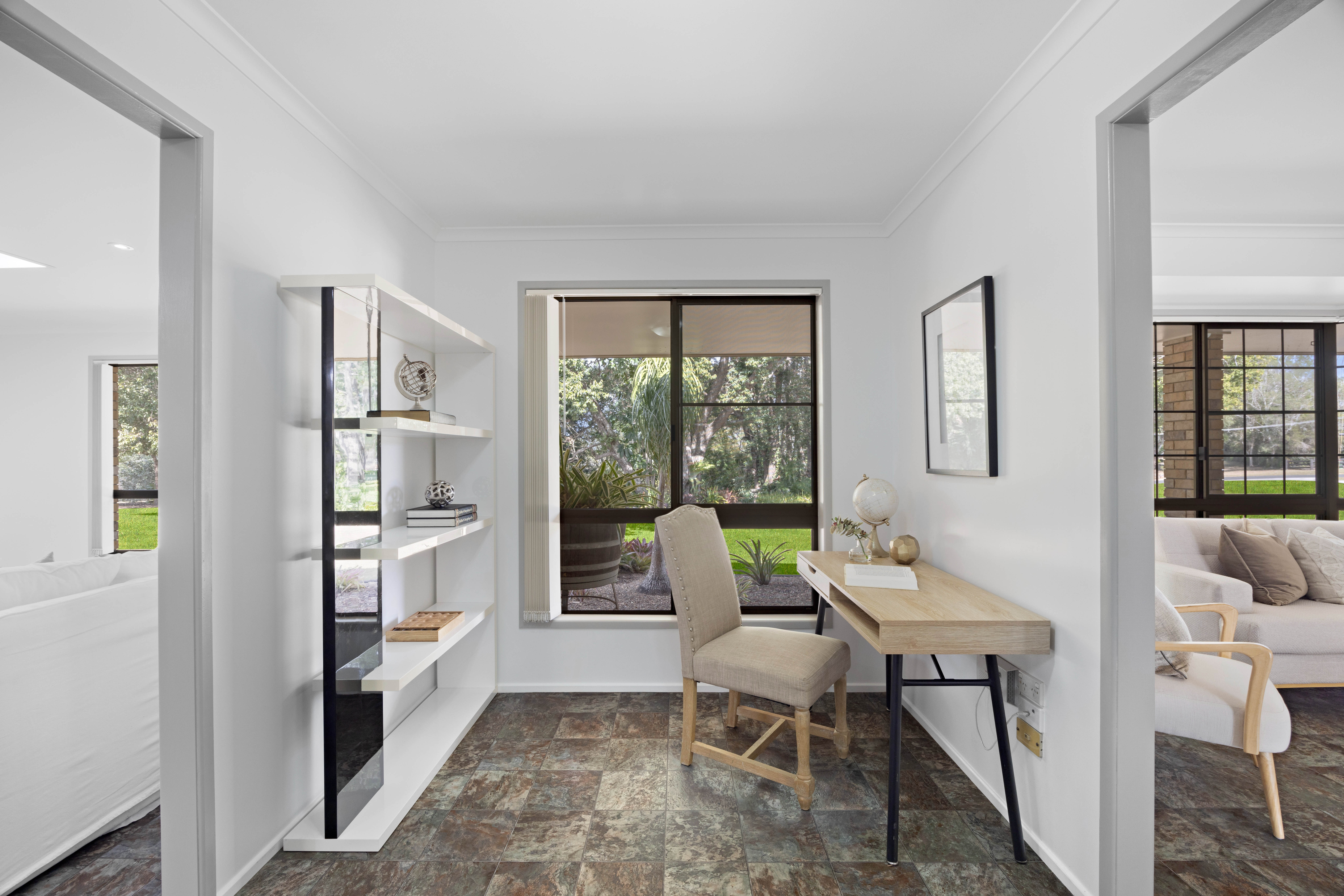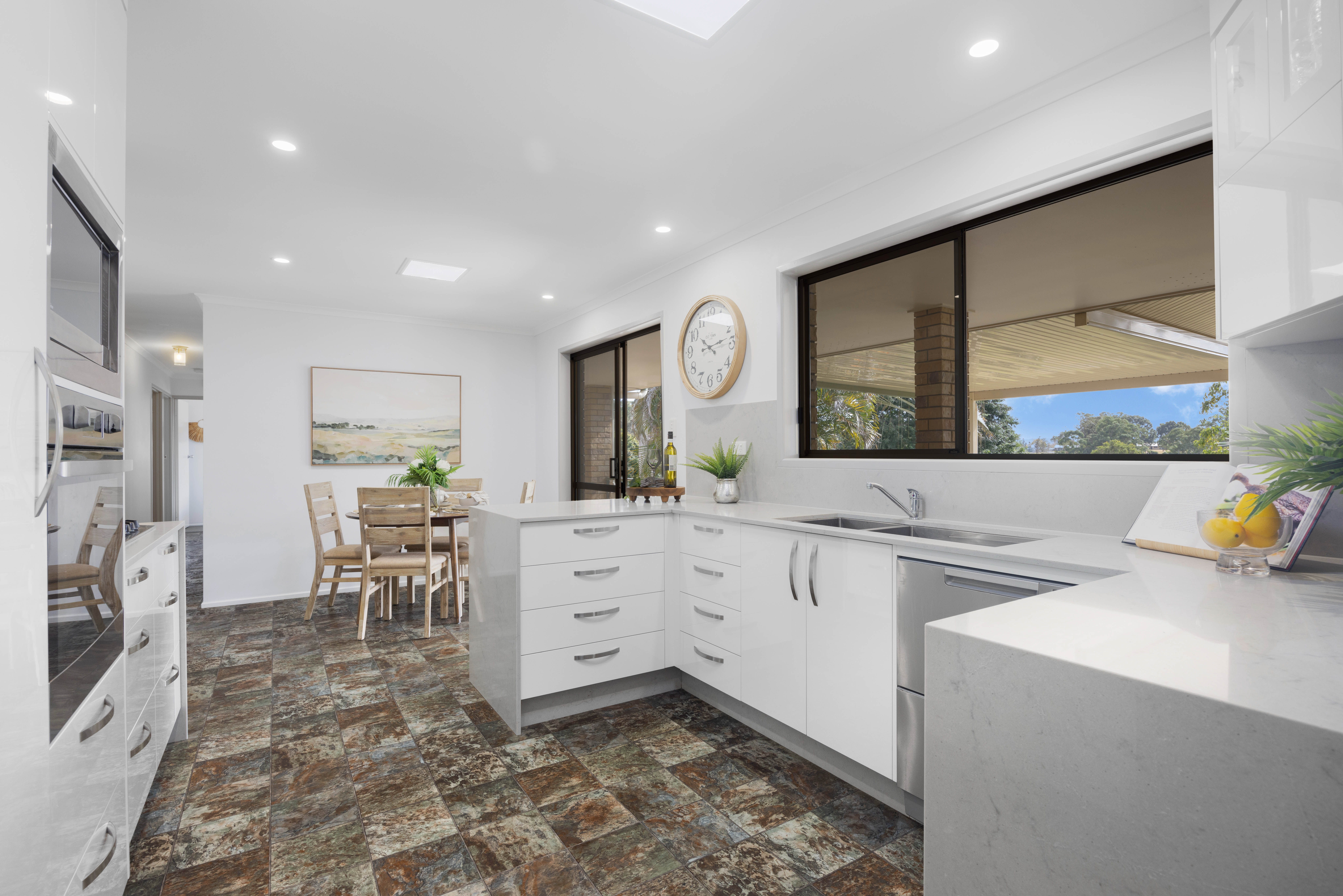 A selection of skylights, picture windows, and sliding doors illuminate the home, which features lots of living space, a 2pac kitchen, a study, three bedrooms, one bathroom, and the potential to create a fourth bedroom with an ensuite.