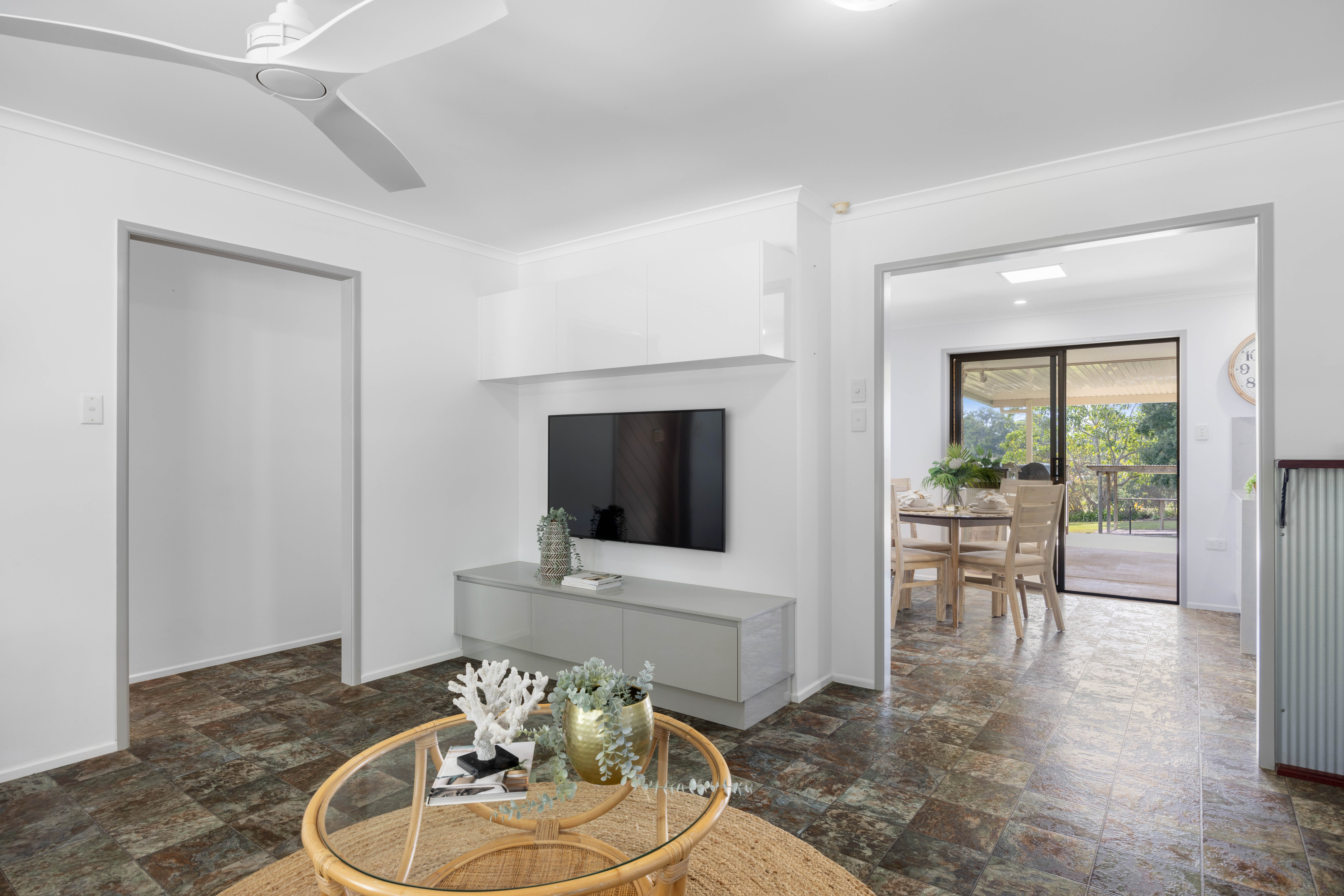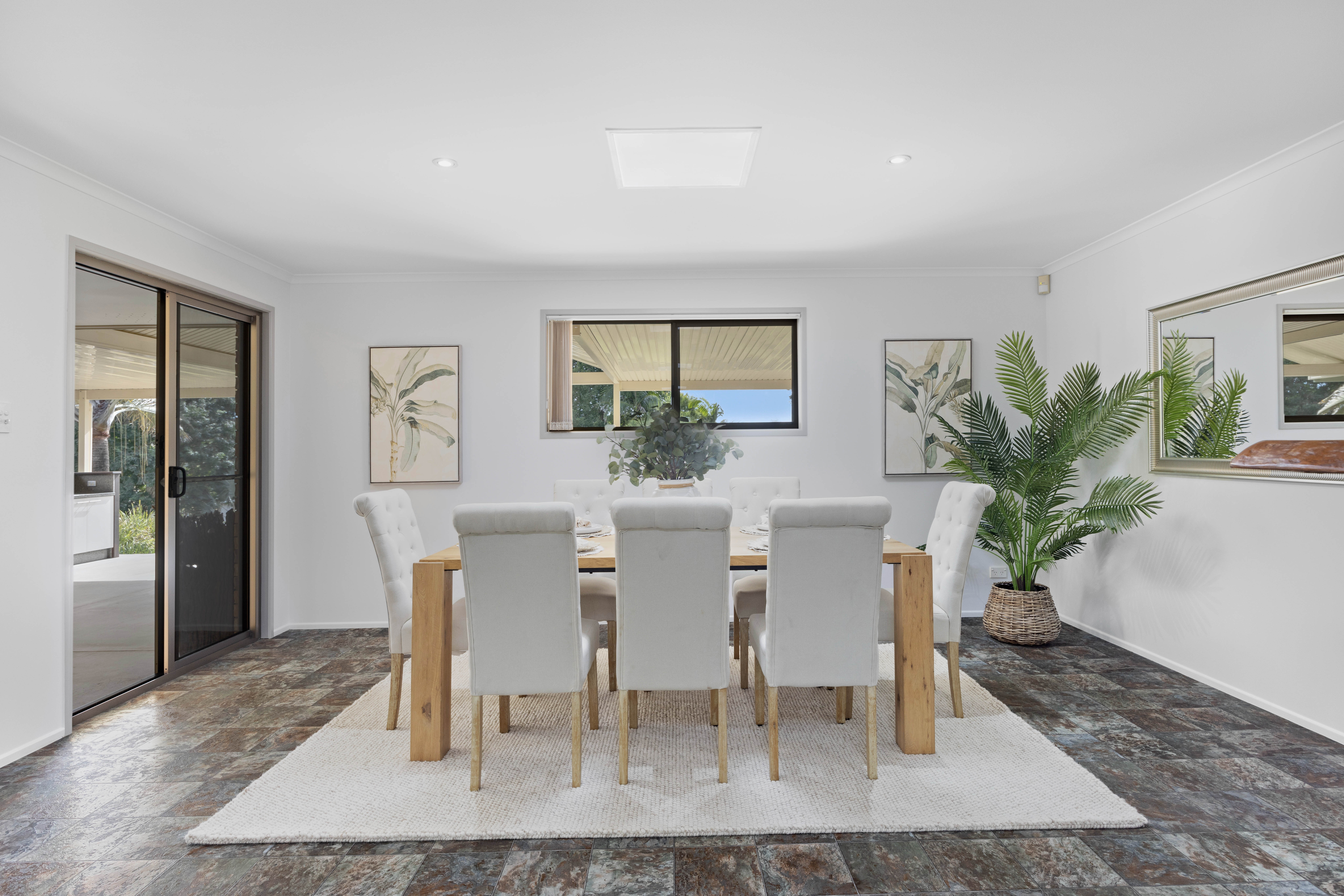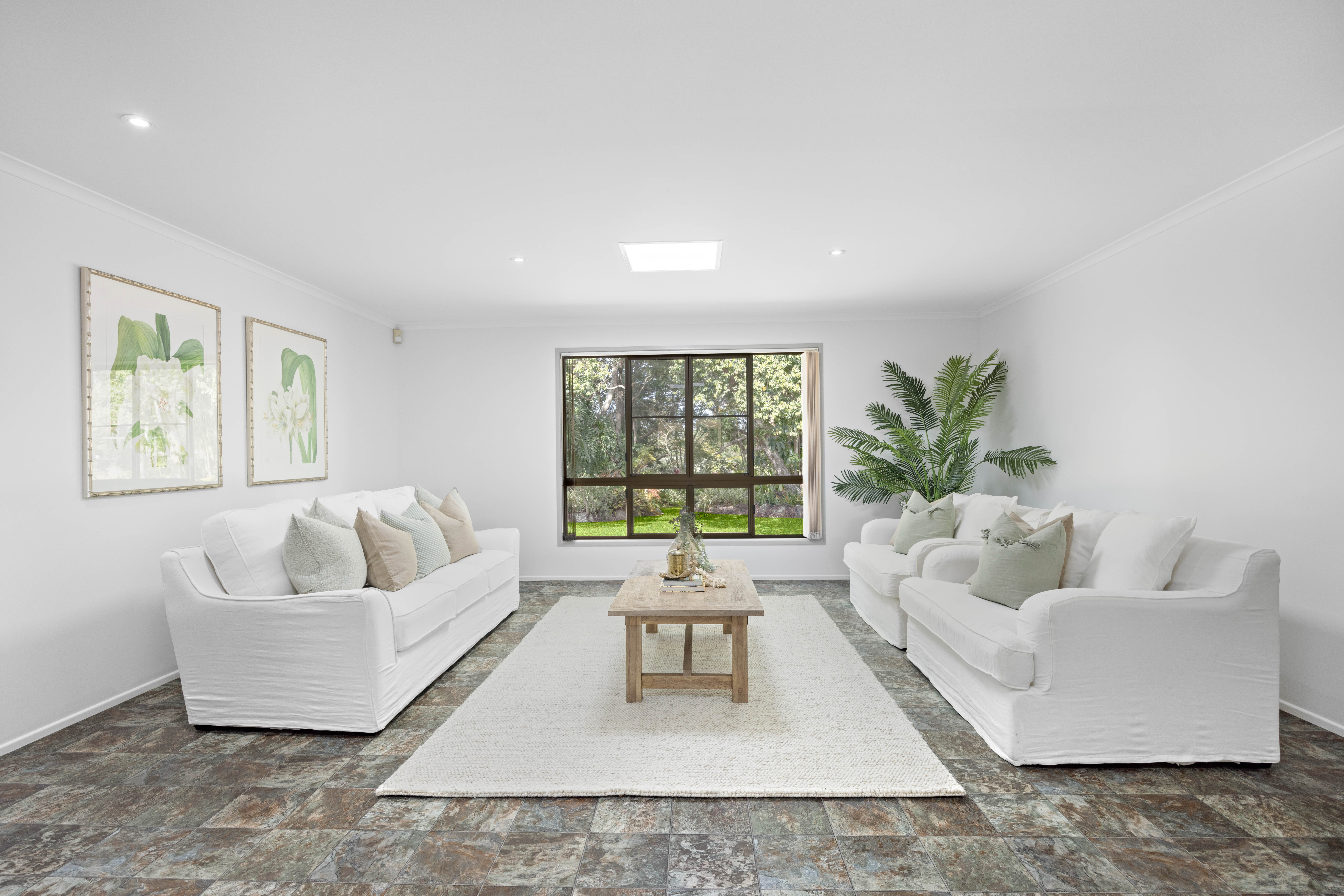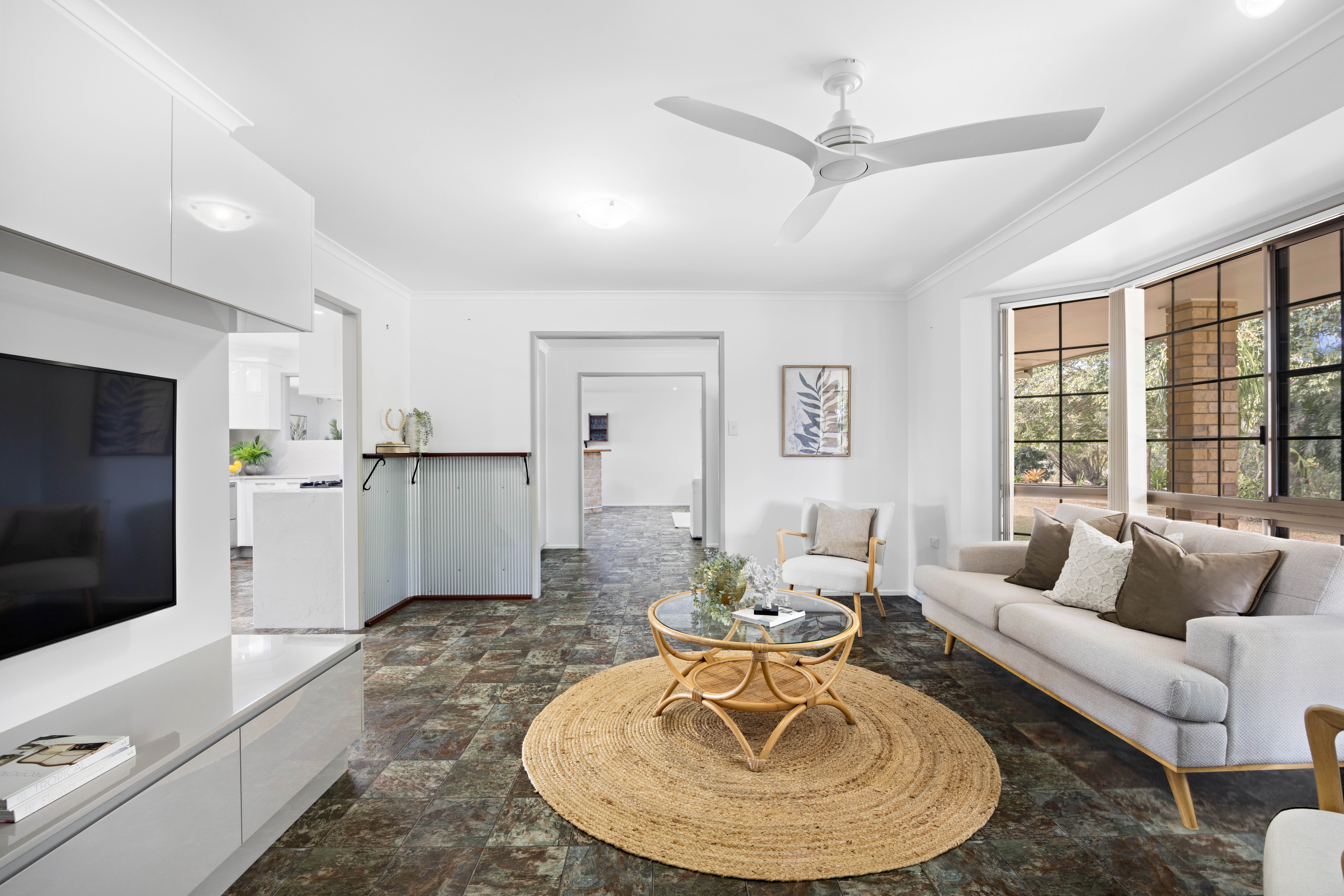 A selection of skylights, picture windows, and sliding doors illuminate the home, which features lots of living space, a 2pac kitchen, a study, three bedrooms, one bathroom, and the potential to create a fourth bedroom with an ensuite.