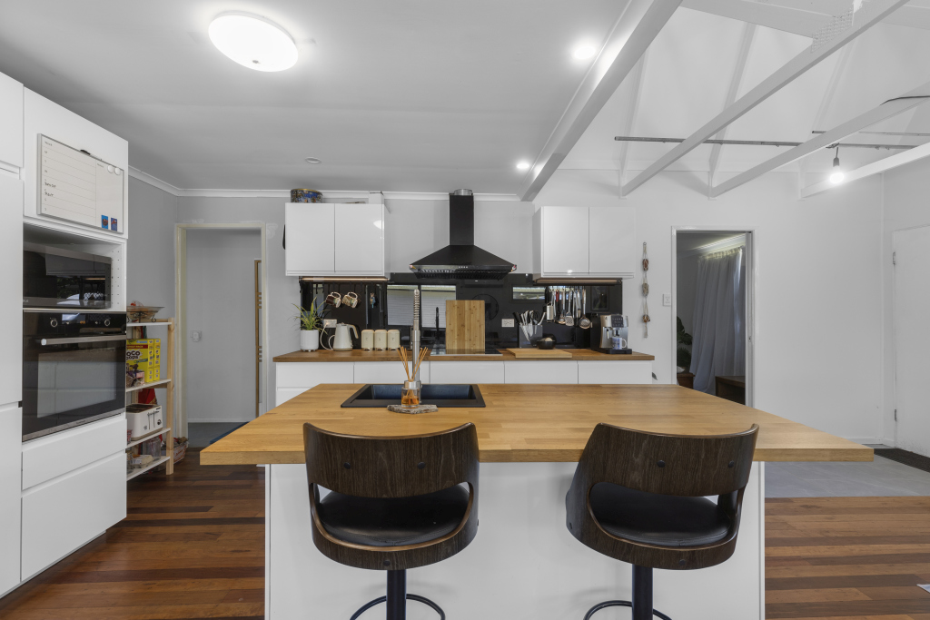 A modern kitchen in the heart of the home boasts timber feature benches accompanied by a functional island bench with breakfast bar, ideal for casual dining or entertaining friends and family.