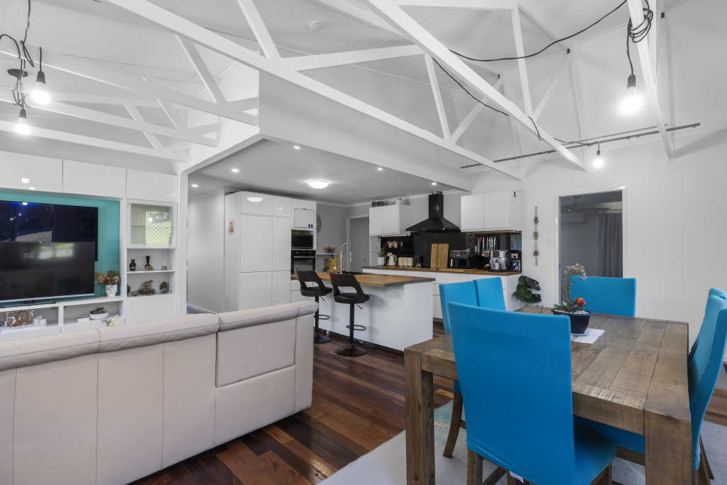 With spacious living areas, enjoy the freedom of open-plan living with a seamless flow between the lounge, dining, and kitchen areas. The exposed rafters and raked ceiling add a touch of rustic charm, enhancing the sense of space and light.